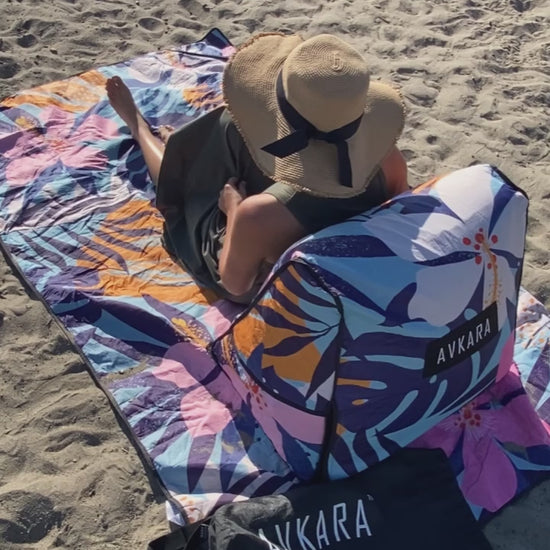 The Earth Lounger is designed with a removable bladder for easy maintenance. Durable and vibrant materials that allow sand to fall off freely, a water-resistant bottom that keeps you dry and clean from the elements, four large corner pockets to add weight for windy days, four loops for ground stakes for even windier days and lastly, two large side pockets on the backrest for personal items.