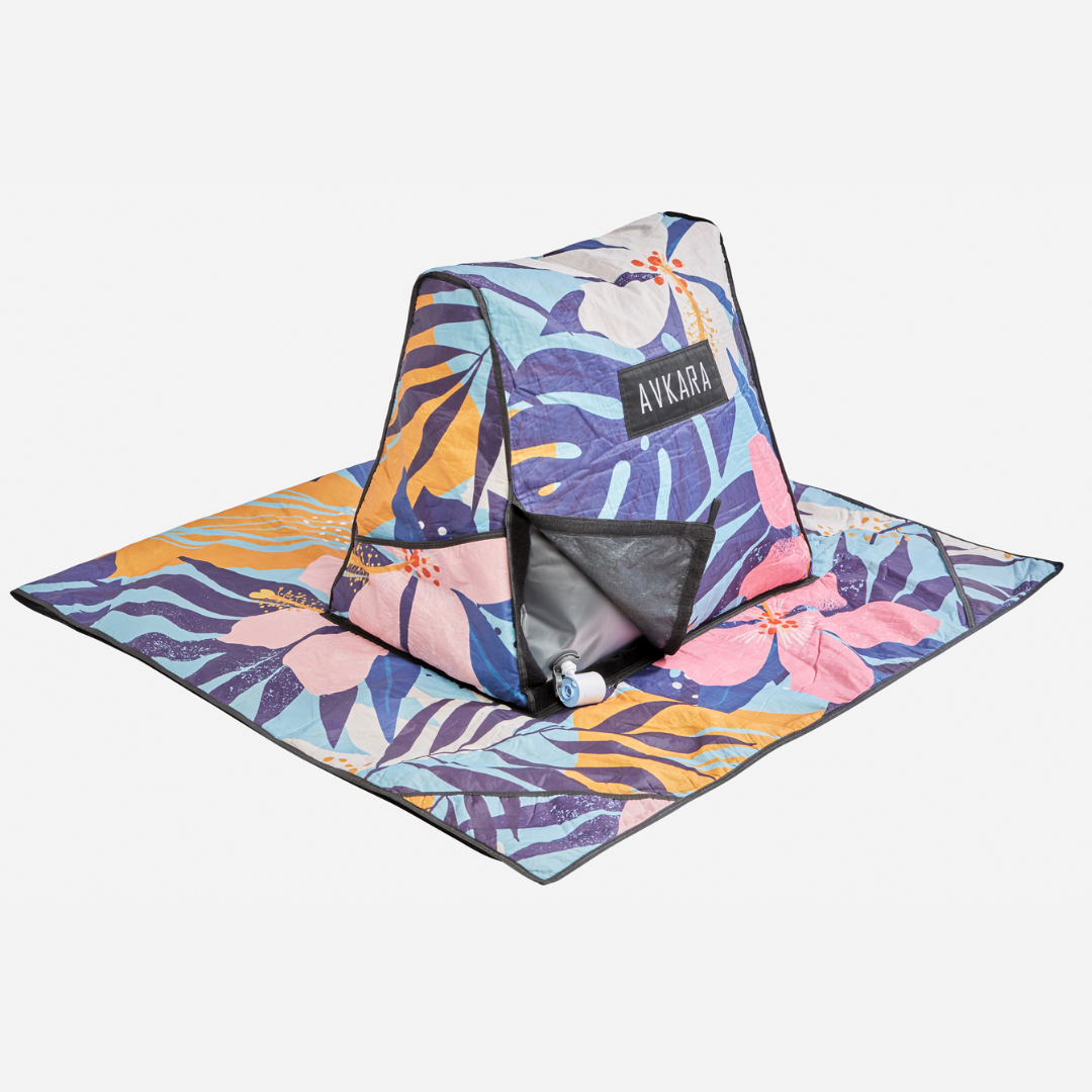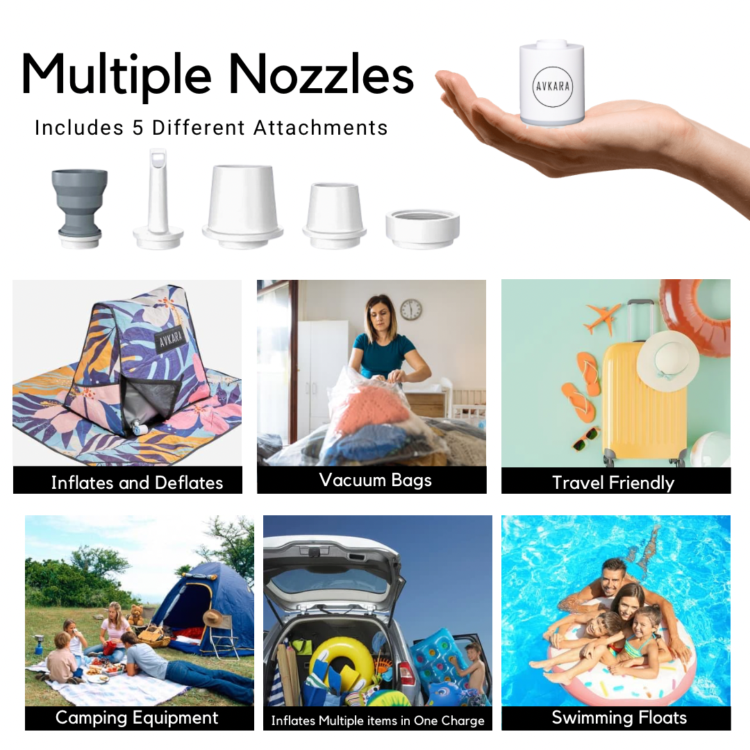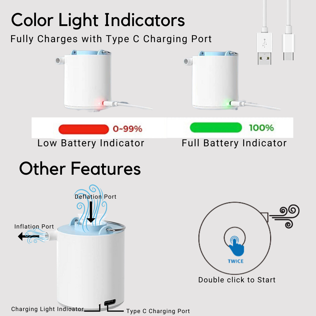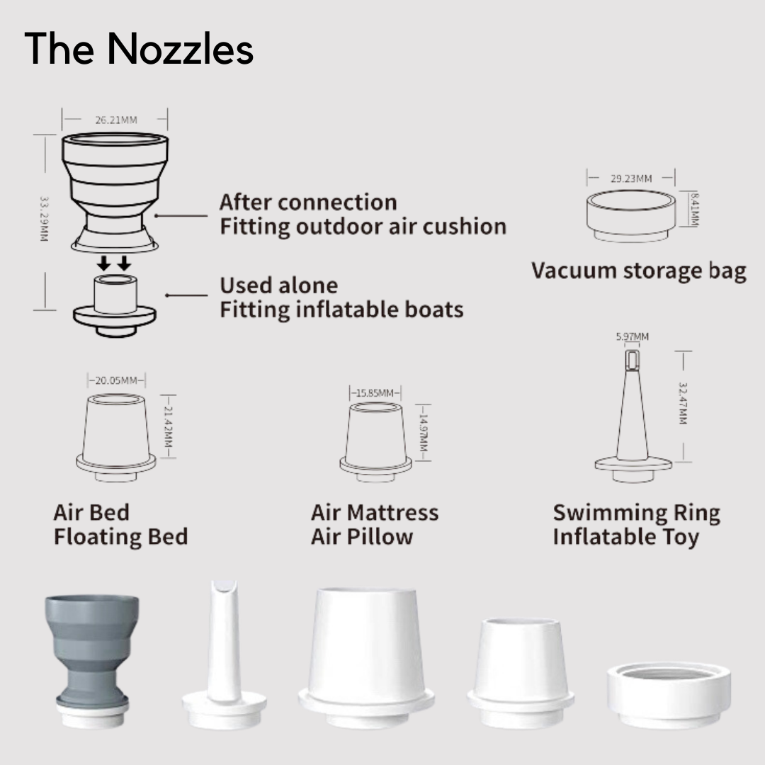 The Tiny Pump charges and can work up to 15 minutes after a single charge. The built-in 1300mAh polymer lithium battery can inflate your Earth Lounger in less than 1 minute and also comes with five different nozzles to provide convenient use for all other types of products such as; camping gear, pool floats.