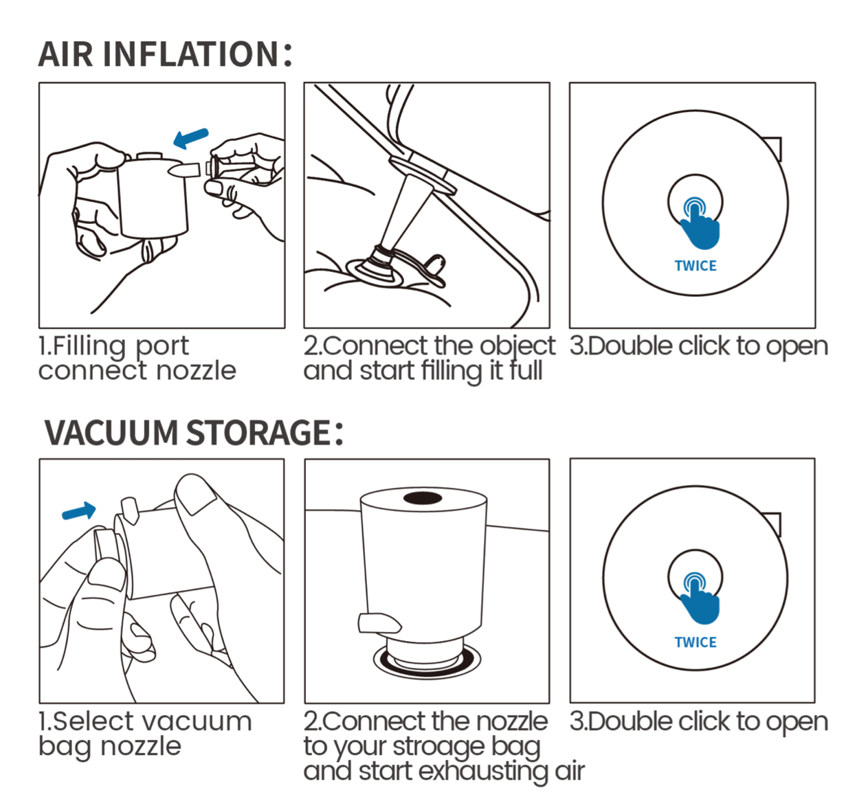 The Tiny Pump can also deflate by switching the nozzle to the top port. Place the equipment inside the provided travel bag for safe keeping and easy storage.